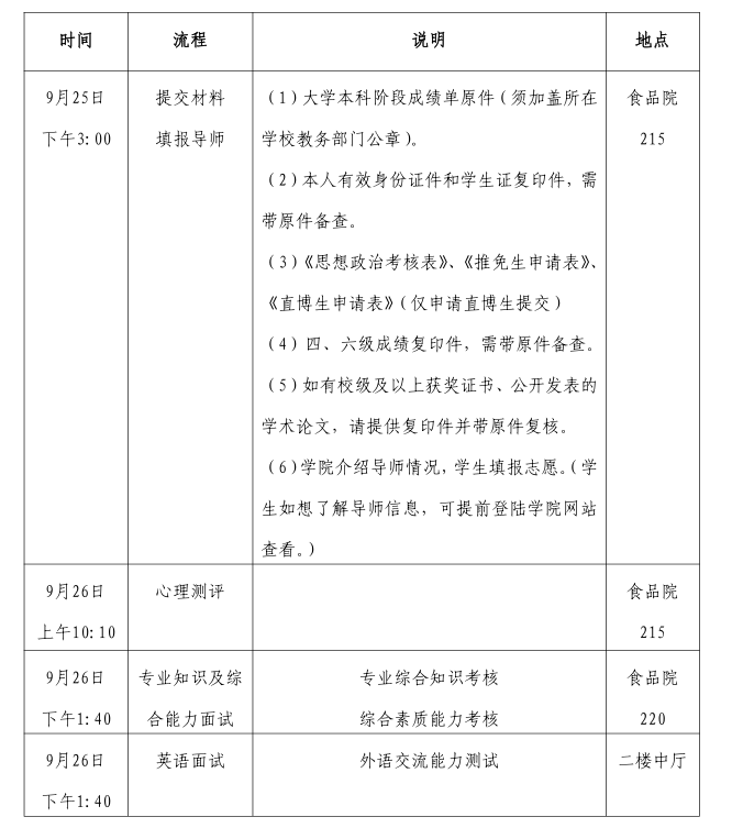 根据《食品科技成人视频 2020年招收推荐免试攻读硕士学位研究生工作办法》,报考我院且初审通过的同学请于9月25-26日参加我院的复试。具体安排如下: