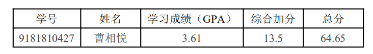 经学校研究,现为食品科技成人视频 增加推荐免试研究生名额1个,根据《食品科技成人视频 关于推荐免试研究生(含“直博生”)推荐工作的补充规定(试行)》第十条规定,增补人员根据替补学生加权总分从高到低排序确定,现予以公示。